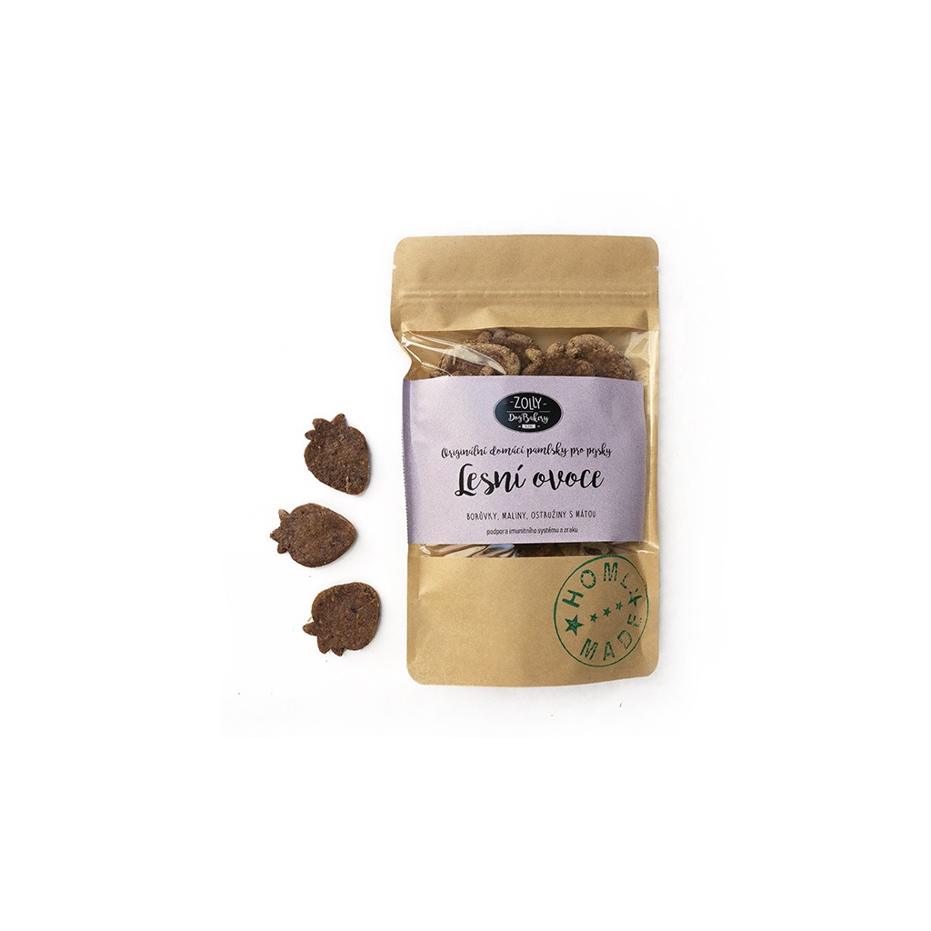 Pamlsky pro psy s osvěžujícím lesním ovocem a mátou. Šetrně pečené při nízké teplotě, bez barviv, konzervantů a jiných umělých přísad.